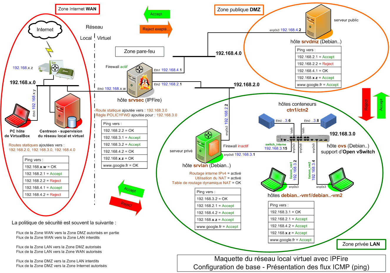 La maquette proposée ci-dessous inclut deux serveurs Debian (zones LAN et DMZ) ainsi qu'un serveur IPFire assurant le rôle de pare-feu pour le réseau (zone WAN).